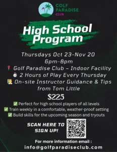 We’re excited to announce a fantastic opportunity for high school golfers in our community! Golf Paradise Club is launching our High School Program – a structured training experience designed to help young golfers develop their skills in a comfortable, weather-proof indoor environment.