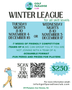 Let’s face it – winter in New Jersey can be brutal for golfers. But at Golf Paradise Club, you don’t have to let your game suffer during the off-season. Our Winter League gives you: